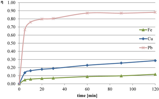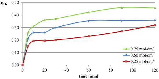 In the first series of leaching experiments, investigations were conducted under conditions where all the leaching parameters were fixed, except for the concentration of l-ascorbic acid. The concentrations of acid in individual trials were 0.25, 0.5, and 0.75 mol/dm3. The remaining leaching parameters had the following values: T = 50 °C, l/s = 10. In all the series of experiments presented in this study, a constant stirring speed of 250 rpm was set. This speed ensures the highest possible leaching efficiencies for specified geometrical dimensions of the beaker, stirrer, and filling degree of the leaching solution. The obtained results are presented in the leaching efficiency vs. time plots (Figure 1, Figure 2 and Figure 3 for lead, copper, and iron) and the pH values of the solution (Table 1).