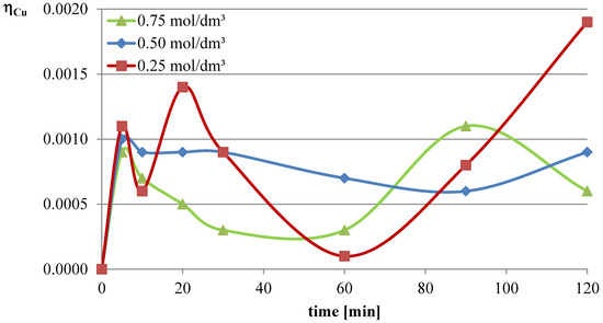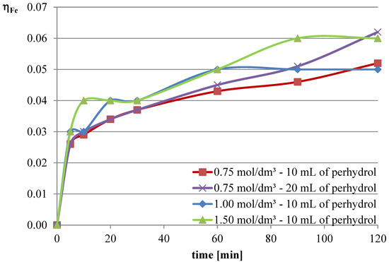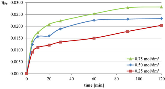 The obtained results clearly indicate that the leaching efficiency of lead from flash smelting slag increases with the increase in the concentration of l-ascorbic acid. Under the conditions of the first measurement series, it was possible to leach approximately 46% of the lead in the initial slag sample after 90 min of experimentation when using an acid solution at a concentration of 0.75 mol/dm3. For iron, a directly proportional relationship between leaching efficiency and the concentration of the leaching solution is also observed. However, in the case of this element, the maximum leaching efficiency of this measurement series was only approximately 2.8%. Through leaching of copper using ascorbic acid, trace amounts of this element in the solution can be obtained. The maximum leaching efficiency of copper measured in this section was just below 0.19%. Therefore, it can be concluded that l-ascorbic acid solution exhibits relatively high selectivity toward the three metals analyzed in the study.
