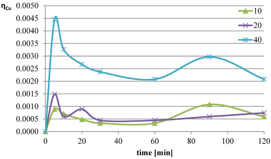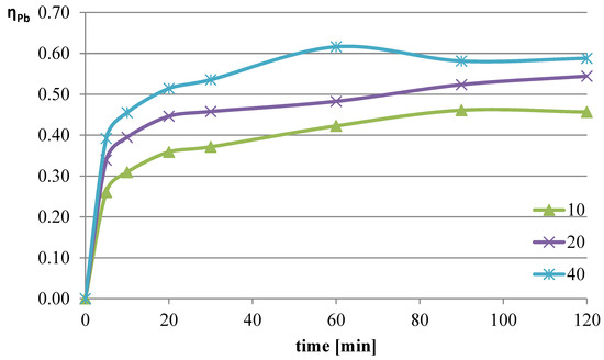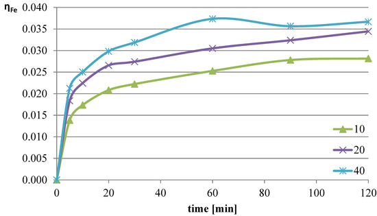 The next parameter investigated was the ratio of the volume of the liquid phase (leaching solution) to the mass of the solid phase (mass of slag sample). Increasing the l/s ratio results in a greater amount of reacting substance relative to the mass of metals contained in the leached slag. The experiments were conducted at a temperature of 50 °C, and the l-ascorbic acid concentration was 0.75 mol/dm3. The l/s parameter in individual trials was set to 10, 20, and 40. The graphs in Figure 4, Figure 5 and Figure 6 show the change in the leaching efficiency of lead, copper, and iron as a function of the process time. The pH values of the solution during the experiments are presented in Table 2.