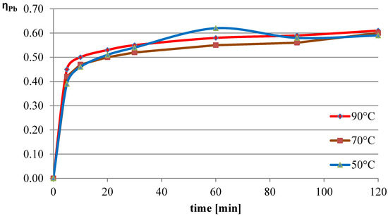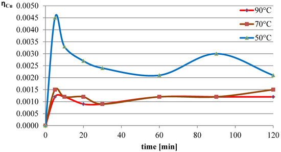 The next variable leaching parameter was temperature, which can affect the reaction rate and process efficiency. Investigations were conducted for three selected temperatures: 50 °C, 70 °C, and 90 °C. The experiments in this section were conducted with the l-ascorbic acid concentration set to 0.75 mol/dm3 and the l/s parameter to 40. The results of the experiments in the graphical form are shown in Figure 7, Figure 8 and Figure 9. The pH values of the solution over the course of the process for the three analyzed temperatures are presented in Table 3.