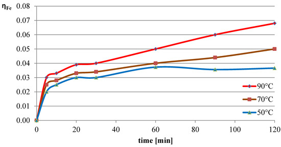 Leaching efficiency of iron at different process temperatures.