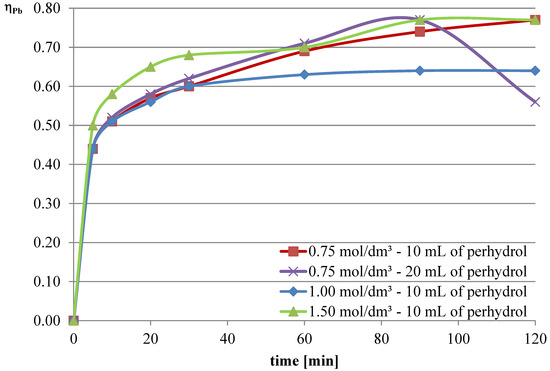 In the next series of experiments, hydrogen peroxide (30% H2O2) was added to the leaching solution of ascorbic acid to increase the leaching efficiency of lead. Two leaching tests were conducted with optimized process parameters obtained in the previous series and two additions of hydrogen peroxide (10 and 20 mL) as well as two tests with increased ascorbic acid concentrations (1 and 1.5 mol/dm3) and the addition of 10 mL of hydrogen peroxide. In each measurement, an increase in the leaching efficiency of all the analyzed metals was observed. Under the conditions of leaching slag with ascorbic acid solution at a concentration of 0.75 mol/dm3 with the addition of 10 mL of hydrogen peroxide, the highest lead leaching efficiency of 77% was achieved, whereas the leaching efficiencies of copper and iron were 5% and 5.2%, respectively.