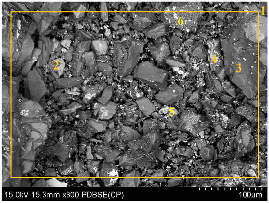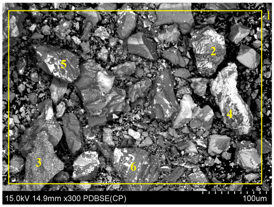 SEM of the solid phase after leaching using a mixture of ascorbic acid and citric acid in the presence of an oxidizing agent along with the observed field (1) and characteristic points (2–6).
