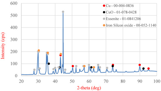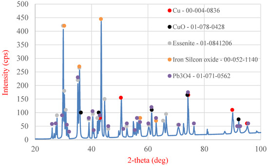The final stage of the analysis of the starting material was X-ray diffraction (XRD) examination (MiniFlex II, Rigaku, Tokyo, Japan) (Figure 20), enabling the determination of the phase composition of the slag. The following phases were identified in the analyzed slag sample: metallic copper, copper oxide (II), lead oxide (II), lead tetroxide (Pb3O4), essenite (CaFeAlSiO6), and a complex oxide containing iron and silicon (Fe2.95Si0.05O4).