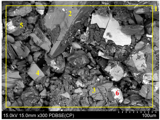 SEM of the solid phase after leaching using ascorbic acid in the presence of an oxidizing agent along with the observed field (1) and characteristic points (2–6).