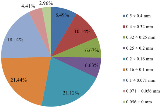 The analyzed slag had a grain size of below 0.5 mm. However, to more precisely determine the share of individual grain classes, a sieving test was conducted using 9 sieves with different mesh sizes. As can be seen from Figure 18, the examined slag does not contain a prominently distinguishable grain class. The two finest grain classes (below 0.056 mm, and 0.056–0.071 mm) each account for less than 5% of mass fraction. The highest shares are characterized by the classes 0.071–0.1 mm (18.14%), 0.1–0.16 mm (21.44%), and 0.16–0.2 mm (21%). The remaining four fractions with the largest grains range between 6.6% and 10.2% in their shares.