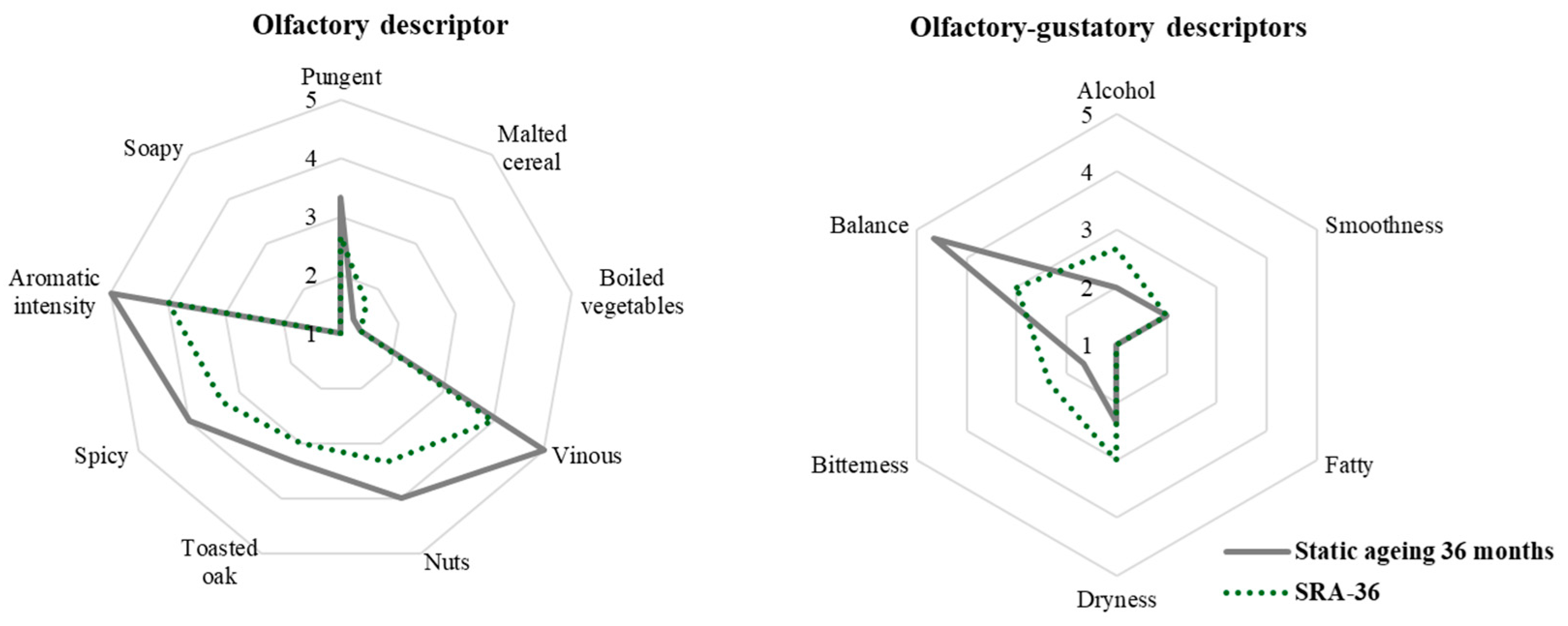 Figure 9). On the nose, the comparison of samples with an average age close to 12 months (12 months of static aging and SRA-12 (11.7 months average age)) and 18 months (18 months static aging and SRA-24 (18.7 months average age)) showed significant differences and in both cases the pungent sensation of the static aging sample was significantly lower. No difference was confirmed between the static malt spirits approaching 24 months of aging (24-month-old static samples and SRA-36 (22-month average age)).