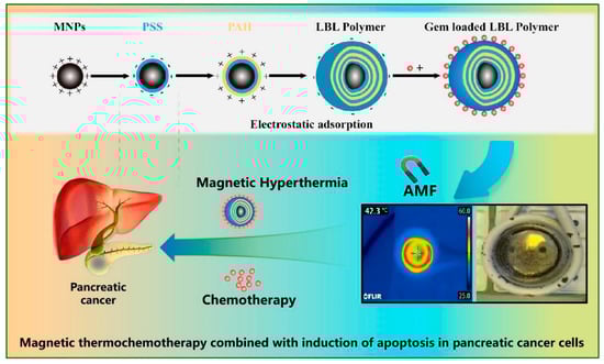 In this study, hyperthermia and chemotherapy, along with various materials and drug-delivery techniques, were developed [10,11,12,13,14,15,16,17]. The layer-by-layer (LBL) method, innovatively introduced by Decher et al., has been extended due to its operational simplicity [18,19]. To achieve precise drug delivery, functional material units must be designed for each component, and carriers that allow flexible control over the structure are highly beneficial. In this study, magnetic nanoparticles were selected as the heat source, and induction heating through irradiation with an alternating magnetic field was utilized. Furthermore, for use in combination with chemotherapy, a polyelectrolyte was coated onto the surface of the magnetic nanoparticles via electrostatic interactions, with the nanoparticles serving as the core and the outermost shell covered with gemcitabine (GEM), a drug delivery carrier used in the treatment of pancreatic cancer (Figure 1).