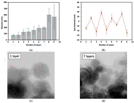 Changes in particle size (a) and zeta potential (b) for LBL MNPs. TEM images of LBL MNPs with 1- (c) and 7- (d) layers.