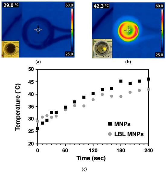 Magnetic hyperthermia, which utilizes MNPs as a heat source, is a technique that transfers heat to tumor cells. This method generates heat through the interaction with alternating magnetic fields (AMF), making it an effective treatment for targeting deep-seated, inaccessible tumors. Heat generation occurs when magnetic nanoparticles are exposed to a magnetic field, with energy being converted to heat during relaxation processes based on the Néel and Brownian relaxation mechanisms. Therefore, it is essential to use AMF rather than direct-current magnetic fields to ensure sustained heat generation. The heat-generation behavior of polymer-coated LBL MNPs under AMF exposure was observed, as shown in Figure 3. When the MNPs were subjected to AMF for 240 s, the temperature of the LBL MNPs suspension increased from 29.0 to 42.3 °C. This temperature increase is similar to that of bare MNPs. Hyperthermia requires a temperature range of 42–45 °C, and the heat generated by LBL MNPs falls within this range, making them suitable for hyperthermia applications. Eddy currents induced by magnetic fields can affect tissues and organs, potentially causing carbonization and necrosis. However, the frequency used in this study was only 281 kHz, which is well below the safe frequency threshold for AMF (100–300 kHz) [21].