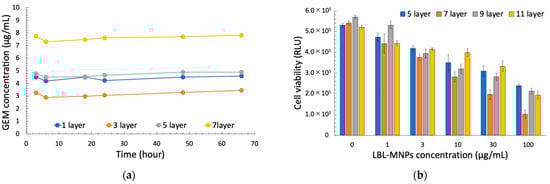 (a) Drug release profile of layer-by-layer magnetic nanoparticles (LBL MNPs) and (b) the effect of LBL MNPs on cell viability. The concentration of released GEM (µg/mL) was measured over time (h) for nanoparticles with different numbers of layers (1, 3, 5, and 7). GEM release showed a layer-dependent profile, with nanoparticles having more layers exhibiting a more sustained release. The data indicate that increasing the number of layers results in prolonged drug release. Cell viability (relative luminescence units, RLU) was assessed after treatment with LBL MNPs at various concentrations (0, 1, 3, 10, 30, and 100 µg/mL). Different numbers of layers (5-, 7-, 9-, and 11-layer) were evaluated for their cytotoxic effects. Data are presented as the mean ± standard error (SE) from three independent experiments (n = 3). Cell viability decreased with increasing LBL MNP concentration, with variations observed depending on the number of layers.