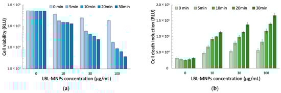 Effects of layer-by-layer magnetic nanoparticles (LBL MNPs) on (a) cell viability and (b) cell death induction. (a) Cell viability and (b) cell death induction were assessed after treatment with 7-layer LBL-MNPs at various concentrations (0, 10, 30, and 100 µg/mL) and different alternating magnetic field (AMF) exposure times (0, 5, 10, 20, and 30 min). After 24 h of treatment, cell viability decreased in a concentration- and time-dependent manner, whereas cell death induction increased accordingly. Data are presented as mean ± standard error (SE) from three independent experiments (n = 3).
