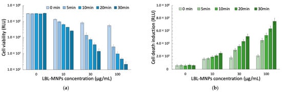 Effects of layer-by-layer magnetic nanoparticles (LBL MNPs) on (a) cell viability and (b) cell death induction. (a) Cell viability and (b) cell death induction were assessed after treatment with 7-layer LBL MNPs at various concentrations (0, 10, 30, and 100 µg/mL) and different alternating magnetic field (AMF) exposure times (0, 5, 10, 20, and 30 min) and X-ray irradiation (5 Gy). After 24 h of treatment, (a) cell viability decreased in a concentration- and time-dependent manner, whereas (b) cell death induction increased accordingly. Data are presented as mean ± standard error (SE) from three independent experiments (n = 3).