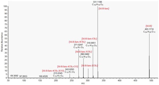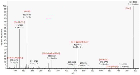 Herein eight compounds were tentatively identified as gallic acid derivatives. They were esters of gallic acid and polyols, usually hexose. Five gallotannins were identified as monogalloyl hexose (7 and 8), digalloyl hexose (11), trigalloyl hexose (12), and tetragalloyl hexose (13). They showed the characteristic fragment ions in their product ion spectra by consecutive elimination of galloyl and gallate moieties. Tetragalloyl hexose (13), [M − H]− at m/z 787.0999 produced a loss of galloyl residue (−152.016 Da) to trigalloyl hexose (at m/z 635.0884), and fragment ions at m/z 617.080 [M − H-GA]−, 465.067 [M − H-2galloyl-H2O]−, 313.057 [M − H-3galloyl-H2O]− (Table 1, Figure 1). Fragment ions at m/z 271.0466, 169.0145 and 125.0250 were observed as cross-ring fragment ions of a hexose molecule, and deprotonated and decarboxylated ions of the gallic acid moieties, respectively [27]. Compound 9 [M − H]− at m/z 169.0142 was identified as gallic acid (GA), based on fragment ions at m/z 125.023 [GA-H-CO2]− and 107.012 [GA-H-H2O-CO2]−, and was further confirmed with an authentic standard [28]. Compound 10 differed from 9 by a CH2 group, demonstrated similar fragmentation pathway and was ascribed to methyl gallate [29].