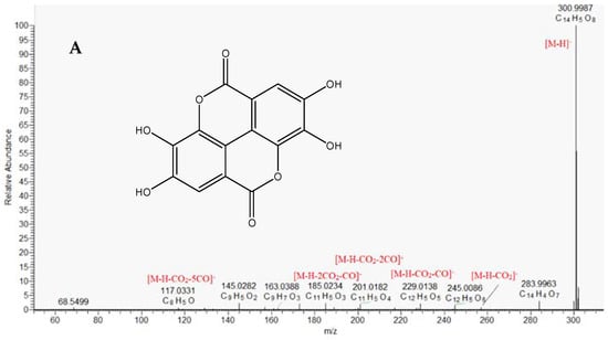 Ellagitannins (ETs) are different combinations of gallic acid, hexahydroxydiphenic acid and its dilactone ellagic acid with hexose, existing in a wide range of states and forms such as monomers (i.e., ellagic acid glycosides), oligomers, and complex polymers. Herein, thirty-one compounds were dereplicated as ellagic acid derivatives. Compound 36 (C14H6O8), [M − H]− at m/z 300.9990 gave fragment ions at m/z 257.007 [M − H-CO2]−, 229.013 [M − H-CO2-CO]−, 201.018 [M − H-CO2-2CO]−, 185.023 [M − H-2CO2-2CO]−. Thus 36 was identified as ellagic acid and was further confirmed by comparison with authentic standard (Table 1). Compounds 38 and 40 (C15H8O8), ([M − H]− at m/z 315.0146) differed from 36 by a CH2 group and gave an abundant ion at m/z 299.991 [M − H-CH3]−. Thus, 38 and 40 were dereplicated as methylellagic acid [29] (Table 1). Similarly, 41–43 and 44 were tentatively identified as dimethyl- and trimethylellagic acid, respectively (Figure 2, Table 1). Compound 22 (C21H10O13) differed from ellagic acid with C7H4O5 moiety and gave a fragment ion at m/z 299.99, corresponding to the loss of deprotonated gallic acid. Therefore, 22 was tentatively dereplicated as valoneic acid dilactone (Table 1). Similarly, 29 was related to valoneic acid dilactone methyl ester.