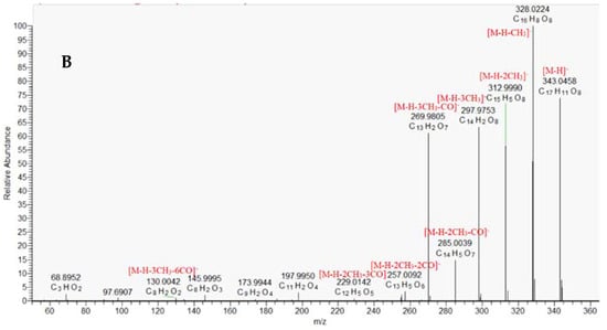MS/MS spectrum of ellagic acid (36) (A) and trimethylellagic acid (44) (B).