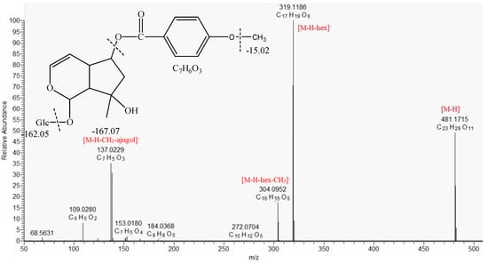 The MS/MS spectrum of compound 49 ([M − H]- at m/z 481.1715) revealed subsequent losses of hexosyl moiety (−162.053) at m/z 319.119, CH3 group at m/z 304.095, and fragment ions at m/z 138.031 corresponding to the hydroxybenzoic acid (Figure 3, Table 1). Hence, 49 was tentatively annotated as methoxybenzoylajugol, previously isolated from the stem bark of Tabebuia avellanedae, Bignoniaceae [34].