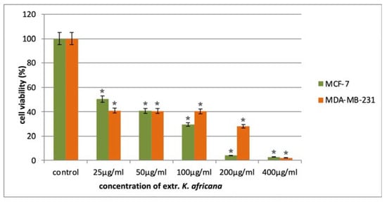 In vitro cytotoxicity of the K. africana extract in the tested concentration range against breast carcinoma cell lines (hormone-responsive MCF-7 breast cancer and triple negative MDA-MB-231 breast cancer). All experiments were run in triplicate and data are expressed as mean ± SD. Statistical analysis of the data was performed via one-way ANOVA (* p-values ≤ 0.01 are considered statistically significant).