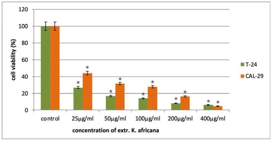 In vitro cytotoxicity of the K. africana extract in the tested concentration range against urothelial bladder carcinoma cell lines T-24 and CAL-29. All experiments were run in triplicate and data are expressed as mean ± SD. Statistical analysis of the data was performed via one-way ANOVA (* p-values ≤ 0.01 are considered statistically significant).