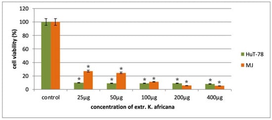 In vitro cytotoxicity of the K. africana extract in the tested concentration range against cutaneous T-cell lymphoma cell lines HUT-78 and MJ. All experiments were run in triplicate and data are expressed as mean ± SD. Statistical analysis of the data was performed via one-way ANOVA (* p-values ≤ 0.01 are considered statistically significant).