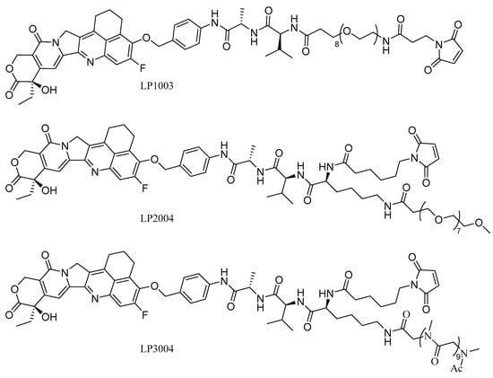 The following supporting information can be downloaded at: https://www.mdpi.com/article/10.3390/molecules30071398/s1. Abbreviation, the synthesis of compounds, and copies of selected 1H NMR, 13C NMR, and Mass Spectra are provided in the Supplementary Materials. Supplementary Figure S1. Cell cytotoxicity profiles. Supplementary Figure S2. (a) Payload was used as a control. (b) LP3004 without cathepsin B. (c) LP3004 with cathepsin B for 24 h. (d) LP2004 without cathepsin B. (e) LP2004 with cathepsin B for 24 h. Supplementary Figure S3. (a) MS analysis of 7300-LP3004. (b) MS analysis of 7300-LP2004. (c) MS analysis of 7300-LP1003. (d) MS analysis of 7300-Deruxtecan. Supplementary Table S1: Stability testing of ADCs in PBS at 55 °C. Supplementary Table S2. Subcutaneous tumor model grouping, administration regimen, and TGI after drug treatment of SHP-77 mice. Supplementary Figure S4. Cell cytotoxicity profiles. Supplementary Table S3. Independent sample testing of mouse tumors. * (p < 0.05), ** (p < 0.01), “ns” non-significant. Supplementary Table S4. Independent sample testing of mouse body weight. * (p < 0.05), ** (p < 0.01), and *** (p < 0.001), “ns” non-significant.