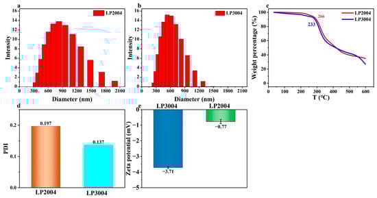 Zetasizer Nano ZS results of LP2004 (a) and LP3004 (b). (c) TGA curves of LP3004 and LP2004. (d) PDI of LP2004 and LP3004. (e) Zeta potential data of LP3004 and LP2004.