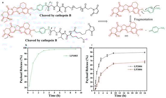 (a) LP1003, LP2004, or LP3004 was efficiently cleaved by cathepsin B in the buffer (R = CO-CH2-PSar10-Ac or CO-CH2-PEG8-Me). (b) Cathepsin B-mediated release of free drugs from LP1003. (c) Cathepsin B-mediated release of free drugs from LP2004 and LP3004.