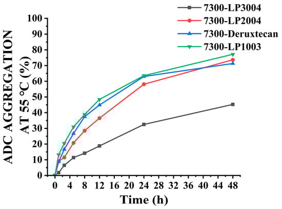The aggregation of ADCs after heating at 55 °C was analyzed using SEC. The increase in aggregation levels among different ADCs was compared to obtain a preliminary stability assessment for each ADC production technology. The aggregation of several ADCs increased significantly after 48 h (Figure 6, Table S1). However, the aggregation level of 7300-LP3004 was significantly lower than that of 7300-LP2004, 7300-LP1003, and 7300-Deruxtecan. These results indicated that the 7300-LP3004 candidate compounds exhibited higher stability.