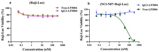 Bystander killing effect of Tras-LP3004 and lgG1-LP3004 co-culture in vitro. (a) Tras-LP3004 and lgG1-LP3004 were cultured separately in Raji-Luc cells. (b) Tras-LP3004 and lgG1-LP3004 were co-cultured in Raji-Luc and NCl-N87, respectively.