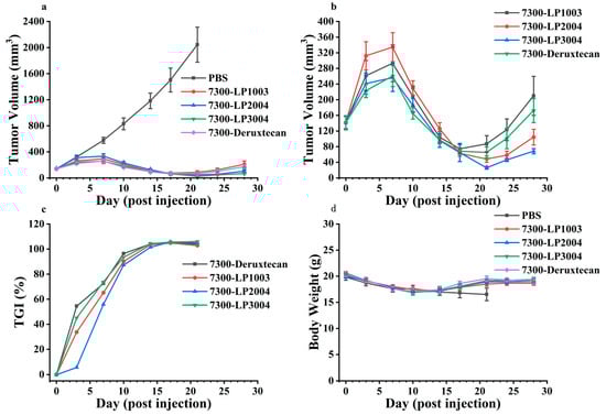 (a) Tumor volume changes in lung cancer tumor mice after different ADC injections. (b) Comparison of tumor volume between the 7300-LP3004 group, 7300-LP2004 group, 7300-LP1003 group, and 7300-Deruxtecan group. (c) TGI of different treatment groups. (d) Body weights of the mice during the treatment period.