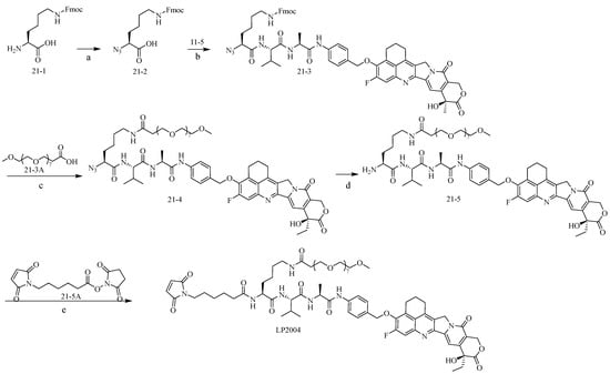 We further synthesized a PEG-modified branched-link LP2004 as shown in Scheme 2. Under alkaline conditions, compound 21-1 reacted with 1H-imidazole-1-azide hydrochloride. The pH was adjusted to 3 using 4 M HCl, and compound 21-2 was extracted with EA, resulting in a yield of 56.07%. In the presence of TEA in DMF, compound 11-5 and compound 21-2 were reacted to obtain compound 21-3 with a yield of 99.57%. In the presence of DEA, the Fmoc-protective groups of compound 21-3 were removed to obtain the corresponding amino compounds. Under the action of HATU, the amino compounds reacted with 21-3A to obtain compound 21-4 with a yield of 57.78%. Compound 21-4 was reduced by P(CH3)3 to obtain compound 21-5 with a yield of 47.66%. Under the influence of TEA, compound 21-5 was reacted with commercially available 21-5A to obtain purified LP2004 with a yield of 53.53%.
