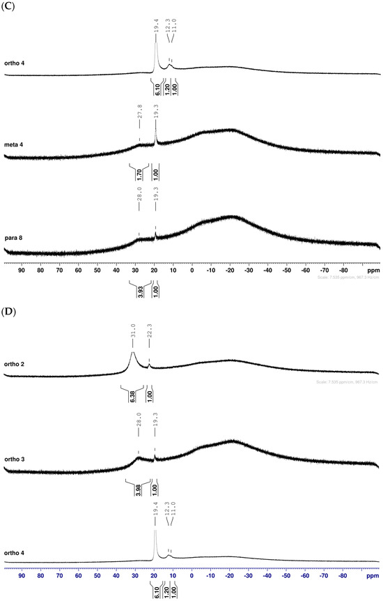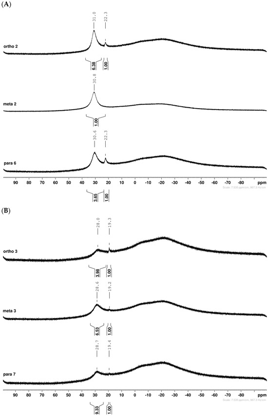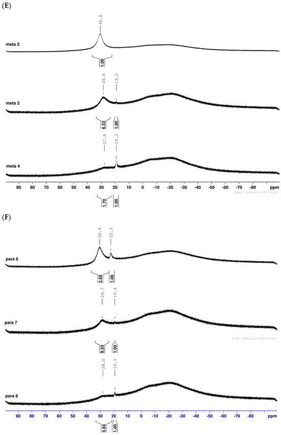 11B-NMR spectral comparisons: (A) for intermediates ortho 2, meta 2, and para 6; (B) for intermediates ortho 3, meta 3, and para 7; (C) for target compounds ortho 4, meta 4, and para 8; (D) for library ortho 2, ortho 3, and ortho 4; (E) for library meta 2, meta 3, and meta 4; (F) for library para 6, para 7, and para 8; (G) for intermediates ortho 2 and meta 2, and side-products ortho 5 and meta 5.