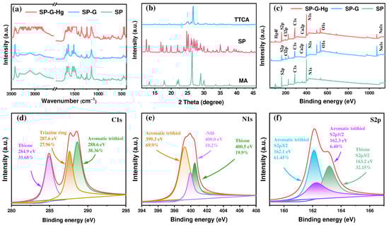 FT−IR (a), XRD (b), and XPS (c) patterns of the as-prepared samples. SP-G (SP after adsorption in the simulated groundwater without Hg) and SP-G-Hg (SP after adsorption in the simulated groundwater with Hg); high-resolution XPS spectra of (d) C1s, (e) N1s, and (f) S2p for the SP.