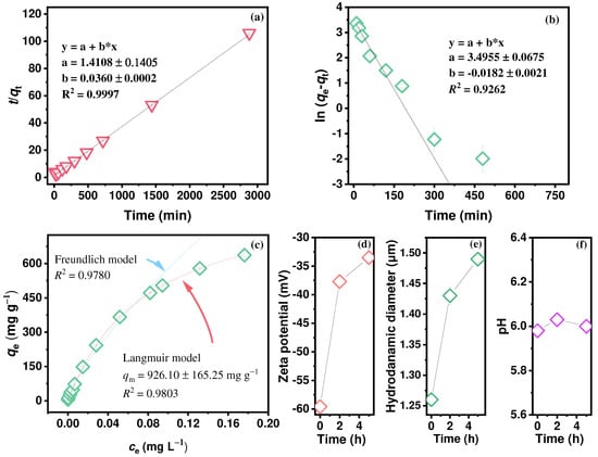 Fitting of the pseudo-second-order kinetic model (a), the pseudo-first-order model (b), and isotherms (c) in the simulated groundwater for mercury adsorption onto the SP (m = 2.0 mg L−1; C0 = 0.01–1.50 mg L−1; T = 298 K); changes in the (d) zeta potential, (e) hydrodynamic diameter, and (f) pH (m = 2.0 mg L−1; C0 = 0.08 mg L−1; T = 298 K).