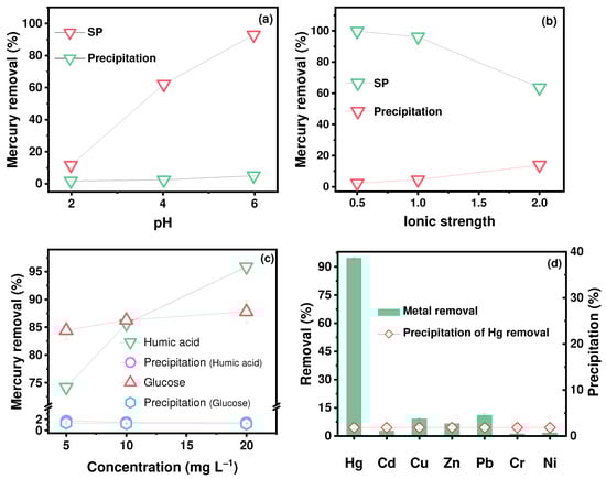 Effects of the (a) pH, (b) ionic strength, (c) DOM, and (d) coexisting heavy metal ions for Hg removal performance from a mixed solution of heavy metal ions. Experimental conditions for (d): 2.0 mg L−1 for the SP, C0 = 4.0 × 10−4 mmol L−1 for Hg and each coexisting heavy metal, and a mass concentration of 0.08 mg L−1 for Hg2+.