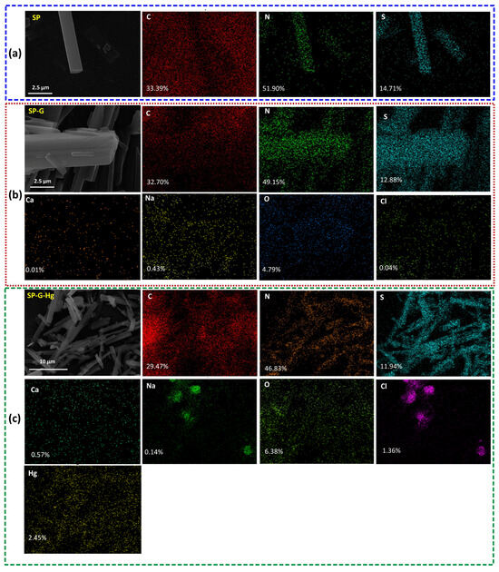SEM-mapping images of individual elements C, N, and S in the SP (a), C, N, S, Ca, Na, O, and Cl in the SP-G (b), and C, N, S, Ca, Na, O, Cl, and Hg in the SP-G-Hg (c). The numbers in the mapping represent atomic percentages.
