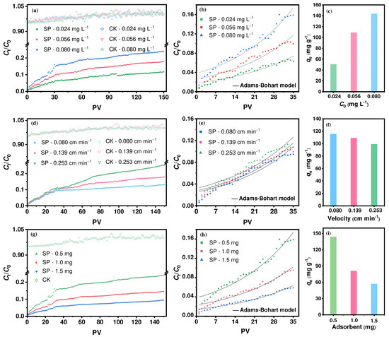 Effects of initial Hg concentration C0, influent pore velocity νp, and adsorbent dosage m in groundwater on breakthrough curve of Hg adsorption on SP in fixed-bed column (25 ± 1 °C). Experimental conditions for (a–c): C0 = 0.024–0.080 mg L−1, νp = 0.139 cm min−1, and dosage m = 0.5 mg. Experimental conditions for (d–f): νp = 0.080–0.253 cm min−1, C0 = 0.056 mg L−1, and m = 0.5 mg. Experimental conditions for (g–i): m = 0.5–1.5 mg, C0 = 0. 080 mg L−1, and νp = 0.139 cm min−1.