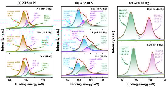 High-resolution XPS spectra of N1s (a), S2p (b), and Hg4f (c) for SP-G, SP-P-Hg (SP after adsorption in DI water with mercury), and SP-G-Hg.