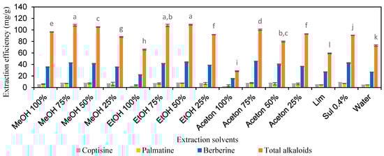 The extraction efficiency of alkaloids from Coptis chinensis by solutions of organic solvents and inorganic acids and bases. Different letters above each column indicate statistically significant differences (p < 0.05).