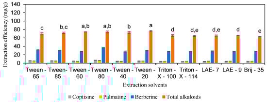 The extraction efficiency of alkaloids from Coptis chinensis by solutions of surfactants. Different letters above each column indicate statistically significant differences (p < 0.05).