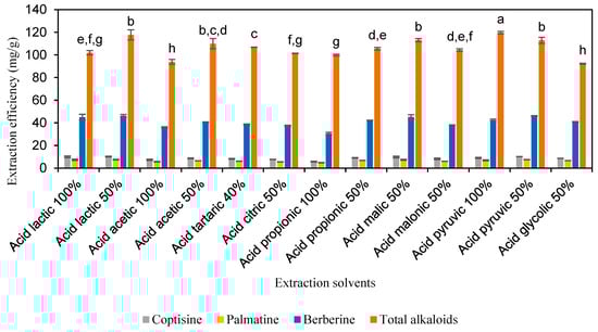 The extraction efficiency of alkaloids from Coptis chinensis by solutions of carboxylic acid. Different letters above each column indicate statistically significant differences (p < 0.05).