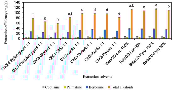 The extraction efficiency of alkaloids from Coptis chinensis by solutions of deep eutectic solvents and supramolecular deep eutectic solvents. Different letters above each column indicate statistically significant differences (p < 0.05).