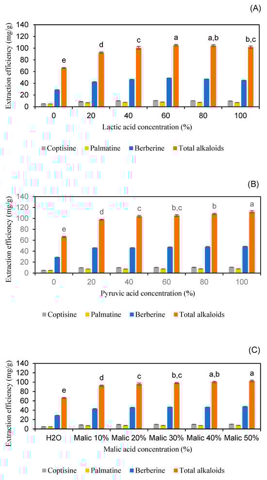 The extraction efficiency of alkaloids from Coptis chinensis using varying concentrations of lactic acid (A), pyruvic acid (B), and malic acid (C). Different letters above each column indicate statistically significant differences (p < 0.05).