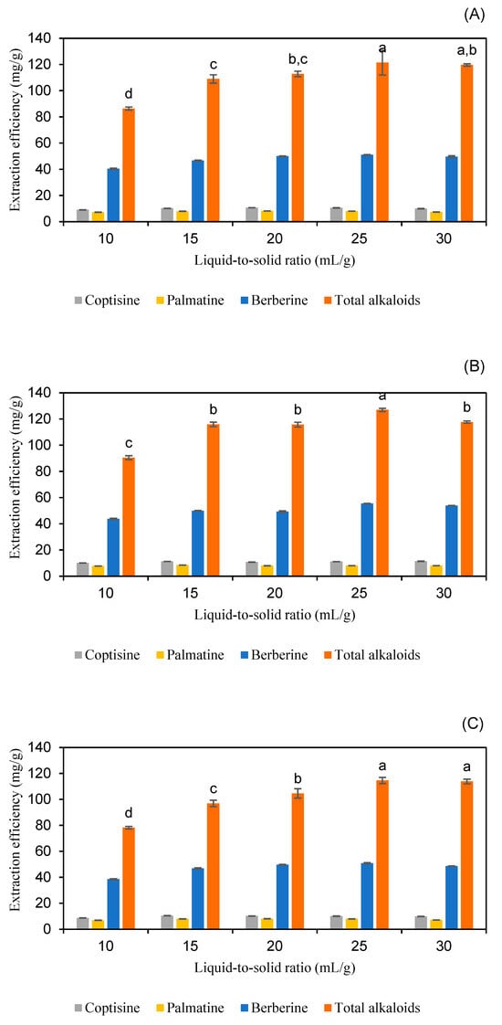 The extraction efficiency of alkaloids from Coptis chinensis using varying liquid-to-solid ratios of lactic acid (A), pyruvic acid (B), and malic acid (C) for each sample. Different letters above each column indicate statistically significant differences (p < 0.05).