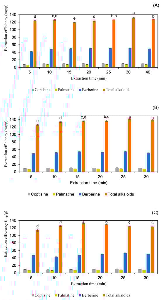 The extraction efficiency of alkaloids from Coptis chinensis using different extraction times with lactic acid (A), pyruvic acid (B), and malic acid (C). Different letters above each column indicate statistically significant differences (p < 0.05).