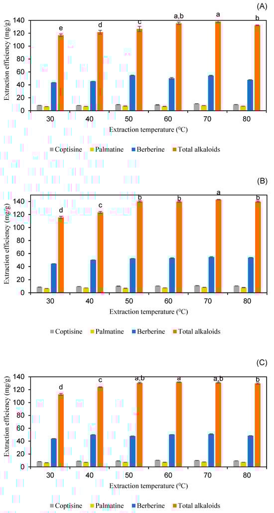 Extraction temperature is a critical factor in determining extraction efficiency. Higher temperatures generally enhance solvent power by reducing viscosity and increasing diffusivity. The lowering of surface tension and weakening of interactions between the target compounds and the sample matrix due to elevated temperatures can improve the desorption and dissolution of the target compounds into the solvent. However, the thermal degradation of compounds can occur at excessively high temperatures [34,35]. Extraction temperatures of 30, 40, 50, 60, 70, and 80 °C were evaluated while maintaining constant extraction conditions. As shown in Figure 8 and Table S8, employing 60% w/w lactic acid for 30 min or 40% w/w malic acid for 15 min resulted in the highest extraction efficiencies for coptisine, palmatine, berberine, and total alkaloids at temperatures of 60 °C and 70 °C, with no statistically significant difference between these temperatures. For 80% w/w pyruvic acid, extraction efficiency peaked at 70 °C when the duration of extraction was 25 min. These results align with previous studies on alkaloid extraction, where moderate temperatures (50–70 °C) were found to be optimal for maximizing yield while minimizing thermal degradation. For instance, Li et al. [20] reported that berberine extraction from C. chinensis was most efficient at 60 °C, with significant degradation observed at temperatures above 70 °C. Similarly, Qiuhong et al. investigated the influence of extraction temperature on alkaloid yield across a temperature range of 40 °C to 100 °C. The results demonstrated that higher temperatures initially facilitated improved extraction efficiency. However, when the temperature exceeded 60 °C, a decline in alkaloid yield was observed, potentially due to thermal degradation. Based on these findings, 60 °C was identified as the optimal extraction temperature to balance efficiency and compound stability [36]. Considering both economic practicality and the preservation of bioactive components [16], 60 °C was selected as the optimal extraction temperature for lactic acid and malic acid, while 70 °C was chosen for pyruvic acid.