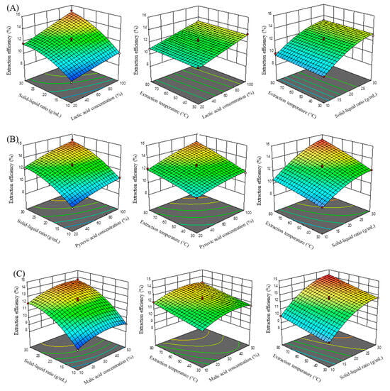Response surface plots of total alkaloid extraction, illustrating the optimization of extraction conditions using lactic acid (A), pyruvic acid (B), and malic acid (C) as solvents.