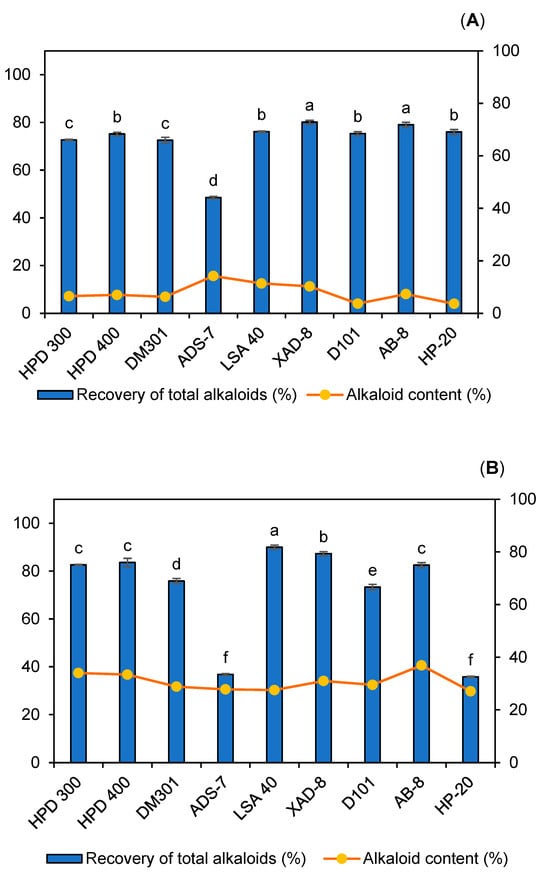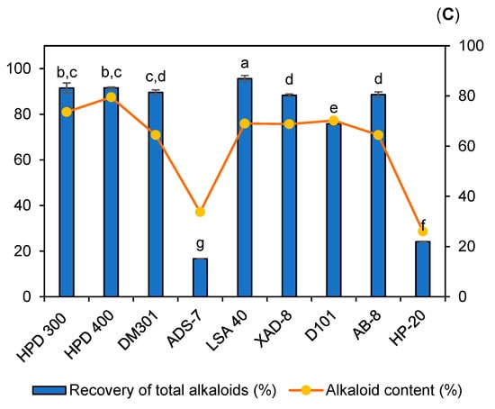 The adsorption and desorption capacities, along with the alkaloid content (%), for the recovery of total alkaloids from the lactic acid extract (A), pyruvic acid extract (B), and malic acid extract (C) of Coptis chinensis. Recovery of total alkaloids (%) refers to the percentage of alkaloids removed from the extract through adsorption onto the resin. Alkaloid content (%) refers to the percentage of alkaloids recovered after desorption from the resin using ethanol. Significant differences within the same graph type are indicated by different letters, as determined by the LSD test (p < 0.05).