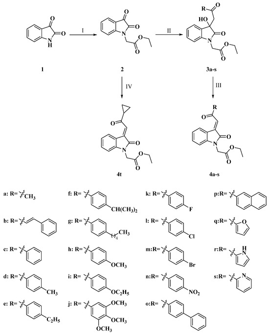 To a solution of ethyl 2-(2,3-dioxoindolin-1-yl)acetate (500 mg, 2.14 mmol) in EtOH (1 mL), Et2NH (265 μL, 1.2 eq) and the corresponding ketones (1.2 eq) were added. The reaction mixture was stirred at room temperature until the complete disappearance of compound 2 as evidenced by TLC. The solid crude products 3b–s were filtered, washed with EtOH and dried, and these crude products were used directly in the next step.