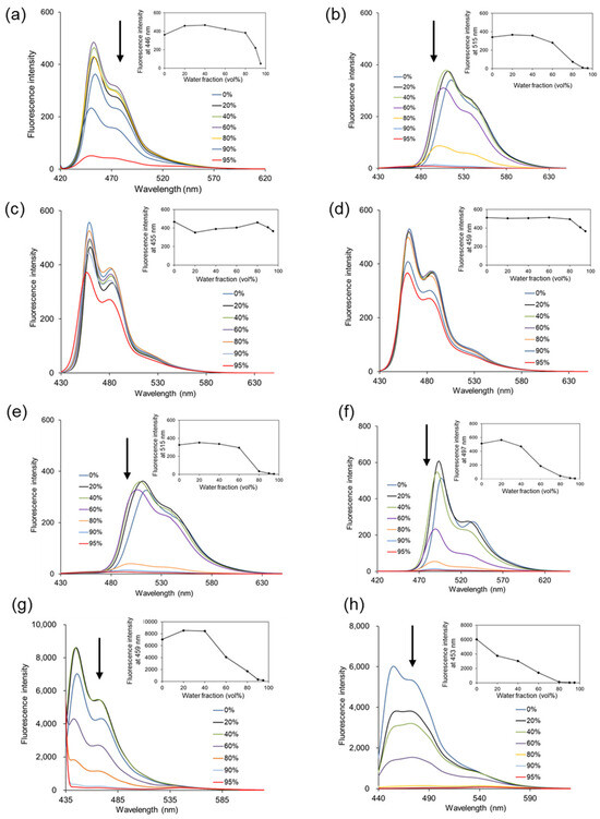 Fluorescence spectra of (a) 3 (10−5 M, λex = 435 nm); (b) 4 (10−5 M, λex = 438 nm); (c) 5 (10−5 M, λex = 441 nm); (d) 6 (10−5 M, λex = 445 nm); (e) 7 (10−5 M, λex = 366 nm); (f) 8 (10−5 M, λex = 368 nm) ); (g) 9 (10−5 M, λex = 432 nm); (h) 10 (10−5 M, λex = 434 nm) in H2O/ethanol mixture with different water fractions. Insets show the fluorescence intensity at each Emmax. The arrows indicate the decrease in fluorescence with increasing water ratio.